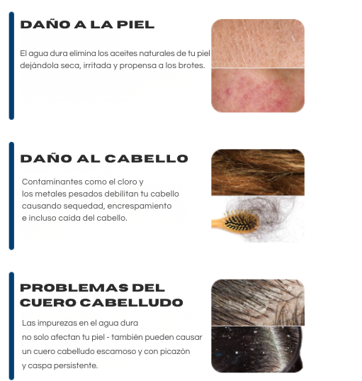 ¿Sabías que el 85% de los hogares en España tienen agua dura? Esta agua está cargada de impurezas como cloro, óxido y metales pesados que causan estragos en tu piel y cabello.