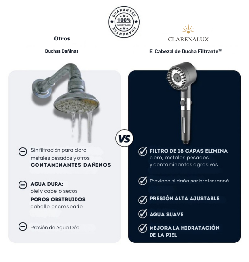 La mayoría de los cabezales de ducha económicos ofrecen poca o ninguna filtración, lo que significa que sigues expuesto a cloro, metales pesados e impurezas en el agua. El sistema de filtración multicapa de ClarenaLux ayuda a eliminar estos contaminantes, reduciendo la irritación de la piel, el daño al cabello y los problemas de sequedad. Con agua más limpia, tu piel se mantiene más suave y tu cabello se siente más sano.