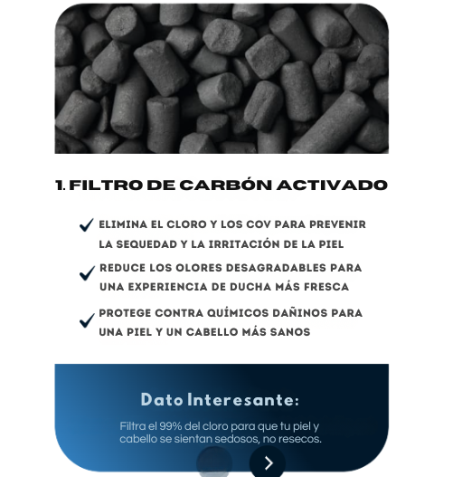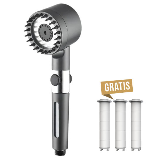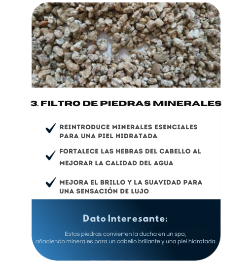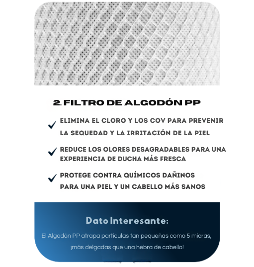 Nuestro sistema de filtración de 18 capas elimina eficientemente el cloro, metales pesados, óxido, arena y otras impurezas, entregando agua limpia y pura para una experiencia de ducha mejorada.