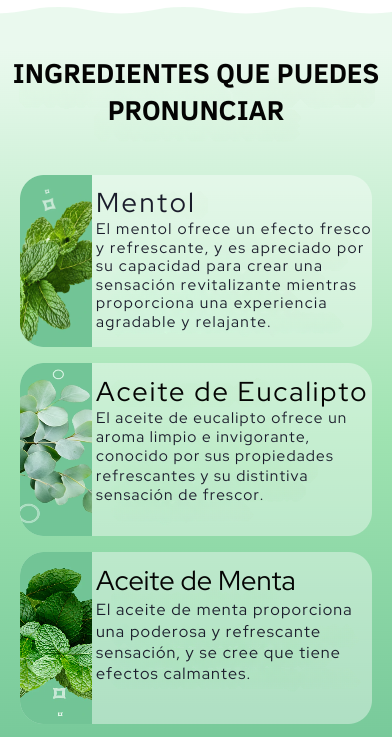 ● MENTA: Mentol, Aceite de eucalipto, Aceite de menta piperita, Aceite de hierbabuena.
